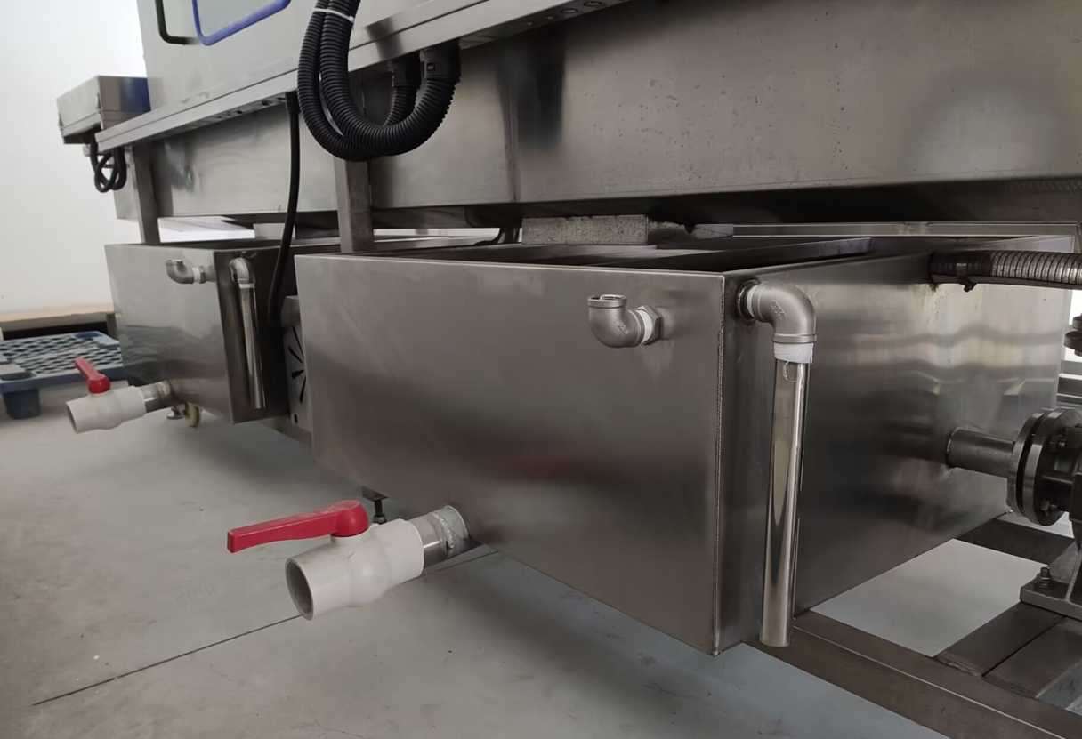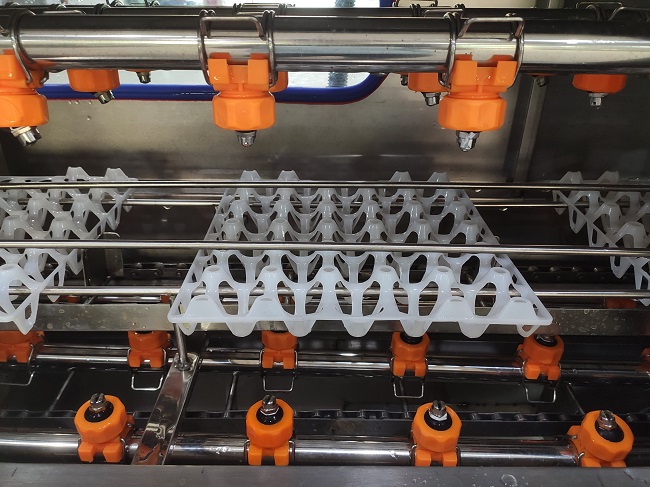-- You can put a stack of plastic egg trays into the de-stacking device manually, 80 trays at a time is recommended, the device will de-stack the trays automatically, and the main conveyor of the machine will send them to the next process. -- Is equipped 2 water tanks, one for egg tray washing, the other for rinsing, the water that is used to wash trays is recycled and used again, there's a filter above each tank that filter impurities to improve recycled water quality, you can add chemicals such as sanitizer or disinfectant(follow the policy of food authority in your area) into water tank to ensure the egg trays meet all the rules and standards for food processing. -- The minimum water consumption is only 0.22 m³/hour, the actual water consumption will depend on how dirty the egg trays are and how often you will replace the water in water tanks.