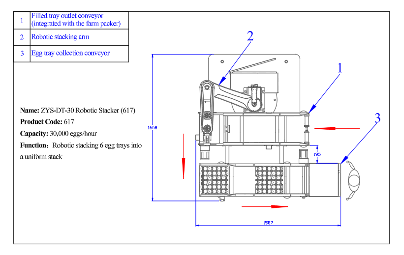 The ZENYER 617 Robotic Tray Stacker is designed to integrate seamlessly with egg farm packers, automating the process of stacking trays at the end of the line to improve efficiency and reduce manual labor.