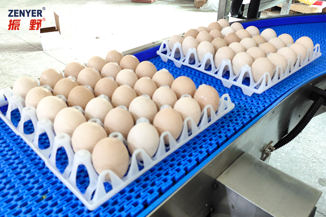 Packs eggs into standard 5×6 trays at up to 36,000 eggs per hour.