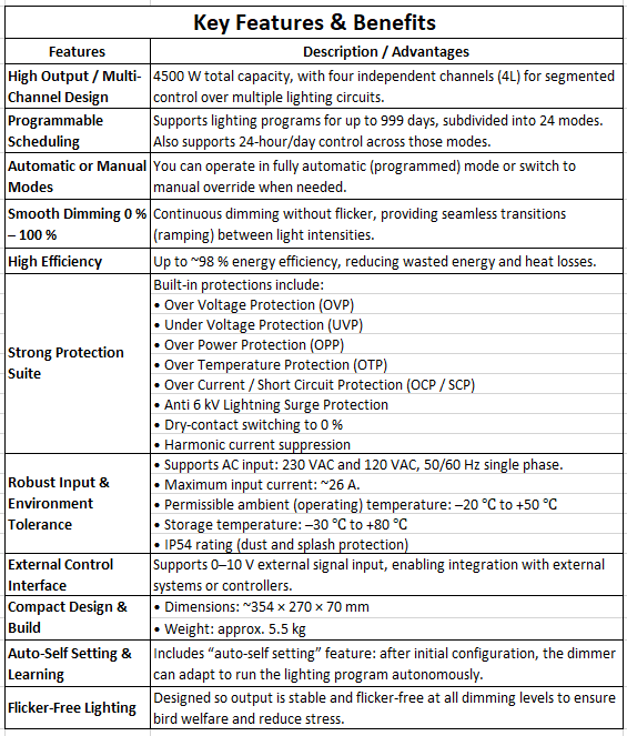 Whether you run fully automated lighting programs or prefer occasional manual intervention, this high-performance dimmer gives you complete control over light levels, transitions, and timing across large zones — helping you achieve consistent results and better flock welfare.