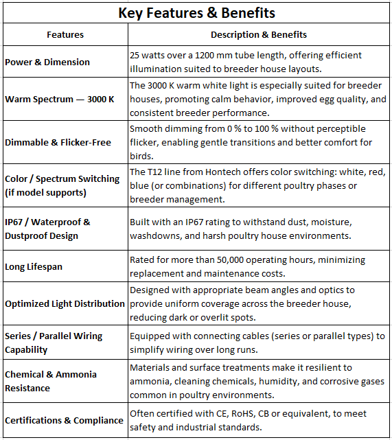 Optimal Use Environment: This tube is ideal for the breeder house phase, where lighting stability, controlled dimming, and spectral tuning (warm tones) are important for breeder physiology and behavior.