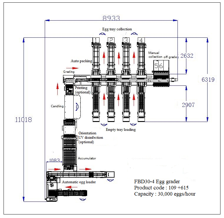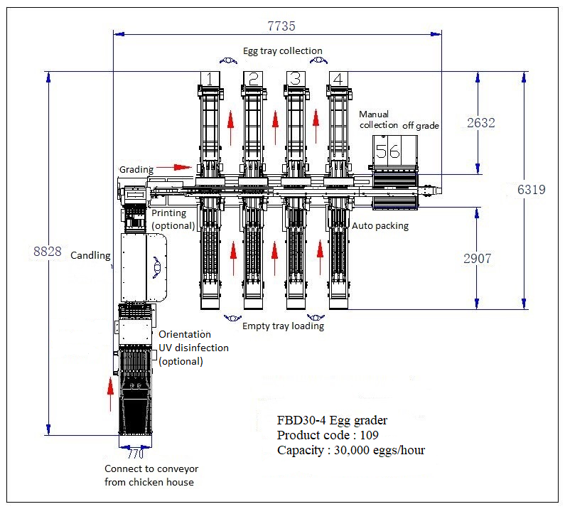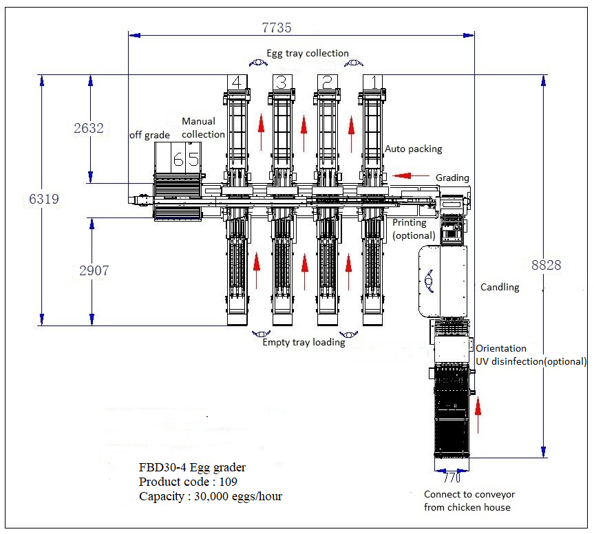 | Function | Egg accumulation, candling & orientation, grading & counting and auto-packing, and optional UV sterilization, egg printer, automatic egg loader and visual AI detector |